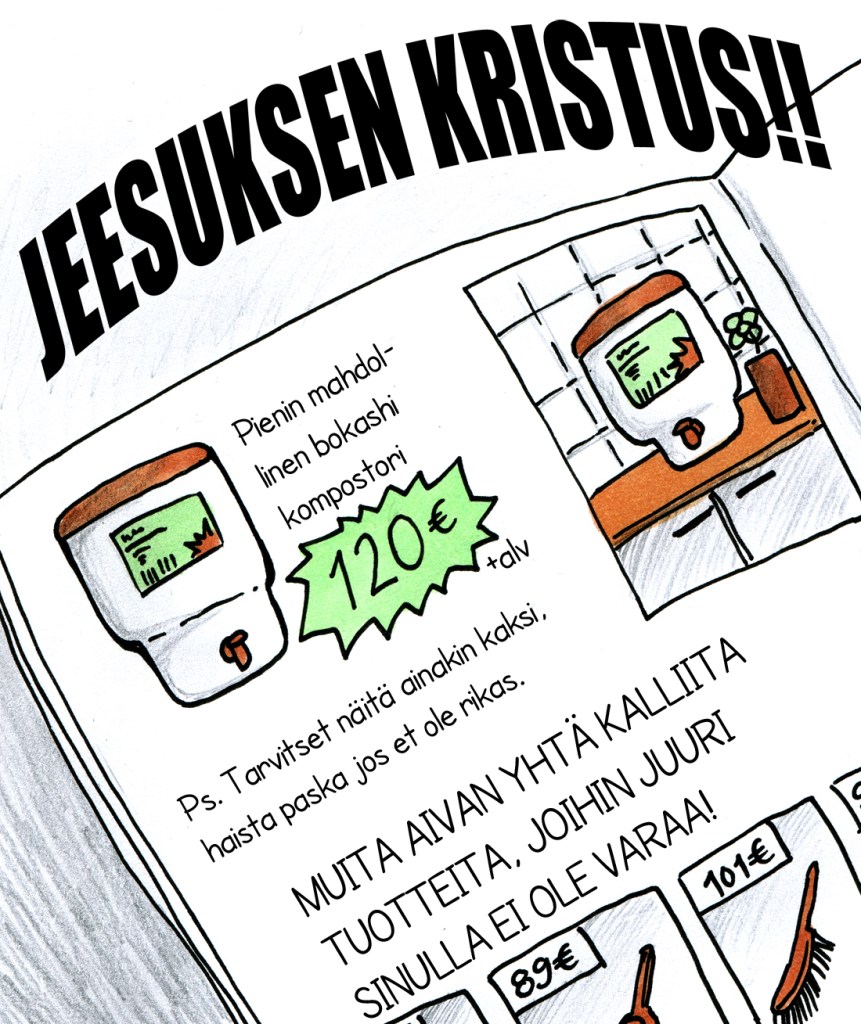 Kyseinen sarjakuva on tehty jo muutama vuosi sitten, jolloin bokashi-settien hinnat olivat vielä paljon korkeammalla. Jos nyt olisin hankkimassa ensimmäistä bokashi-kompostoriani, tekisin sen silti itse! Oma periaatteeni on sellainen, etten osta uutena mitään minkä voin tehdä itse, dyykata roskiksista tai hankkia käytettynä (tässä järjestyksessä). Siksi uskon, että ympäristötietoiselle ihmiselle ohjeeni on yhä relevantti!