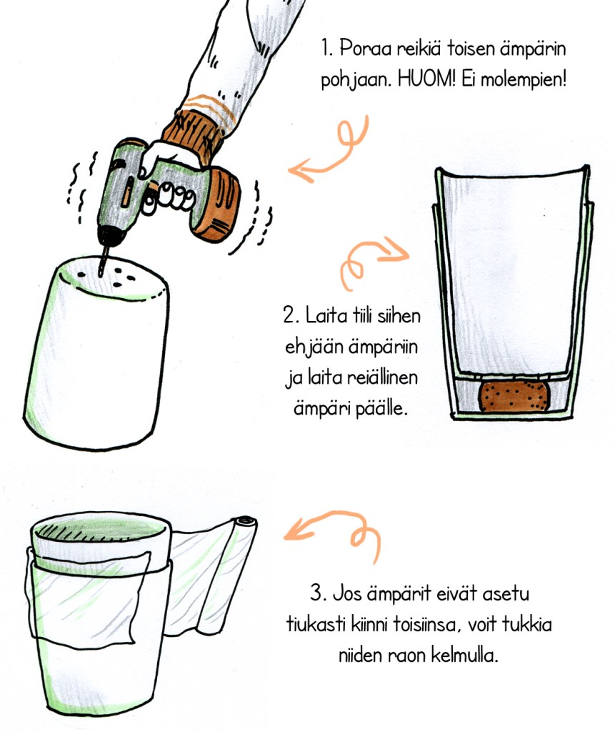 Tässä siis sarjakuvamuotoiset ohjeet siihen, miten voit itse rakentaa oman DIY bokashi-kompostorisi välineistä, jotka monilta löytyvät kotoa tai vähintäänkin Facebookin roskalavaryhmistä ilmaiseksi!