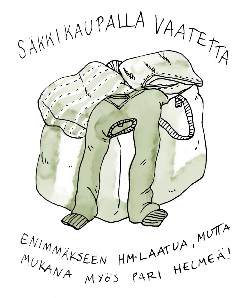 Pidän aina taskussani muutamaa ylimääräistä kassia. Koskaan ei voi tietää mitä löytää ja mistä! Joskus kassista on hyötyä myös siksi, että metsälenkillä sattuu löytämään mahtavan suppilovahveropaikan! Vaikka yleensä kannankin mukanani kangaskasseja, on hyvä ottaa huomioon se, että tekstiilejä kotiin kuljettaessaan, ne kannattaa tuoda sisään muovipussissa, ja tehdä niille saman tien käsittely lutikoiden varalta. Itse noudatan marttojen neuvoja! Lutikoiden ja muiden syöpäläisten kanssa ei kannata ottaa riskejä. Tekstiileistä helpointa on löytää vaatteita, joiden laatu on enimmäkseen melko huonoa. The Wall Street Journal kertoo artikkelissaan, että ihmiset käyttävät uutta vaatetta keskimäärin vain noin 7 kertaa! En siis ihmettele, miksi roskikset ovat täynnä vaatteita. Koko muotiteollisuus vaatisi aivan oman blogikirjoituksensa, sillä siinä vasta on perkaamista! Dyykkaamisen avulla olen kuitenkin tullut sellaiseen tilanteeseen, että en osta enää lainkaan vaatteita. Ainoa asuste, jota kaipaisin, ovat metallikärkiset työkengät, mutta olen melko varma, että ennemmin tai myöhemmin myös sellaiset löytävät tiensä luokseni ilman, että raha vaihtaa omistajaa.
