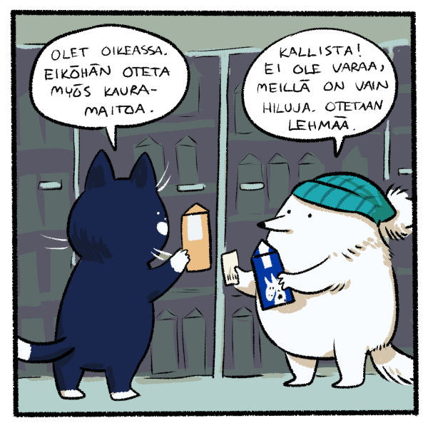 Eeli Laanisen nettisarjakuvassa kissa ja koira adoptoivat kolme kissanpoikaa. Lastensadulta kuulostava asetelma ei tosin ole sitä miltä näyttää, vaan tarina keskittyy käsittelemään arkipäivän ongelmia. Mistä saadaan rahat lasten madotuksiin, kun töitä etsiessä löytyy vain palkattomia harjoitteluja? Elämän pienten ja suurten ongelmien kuvausten vastapainoksi absurdiutta tuo se, että päähahmot ovat eläimiä.