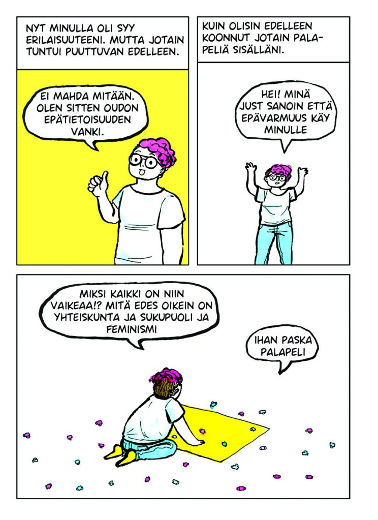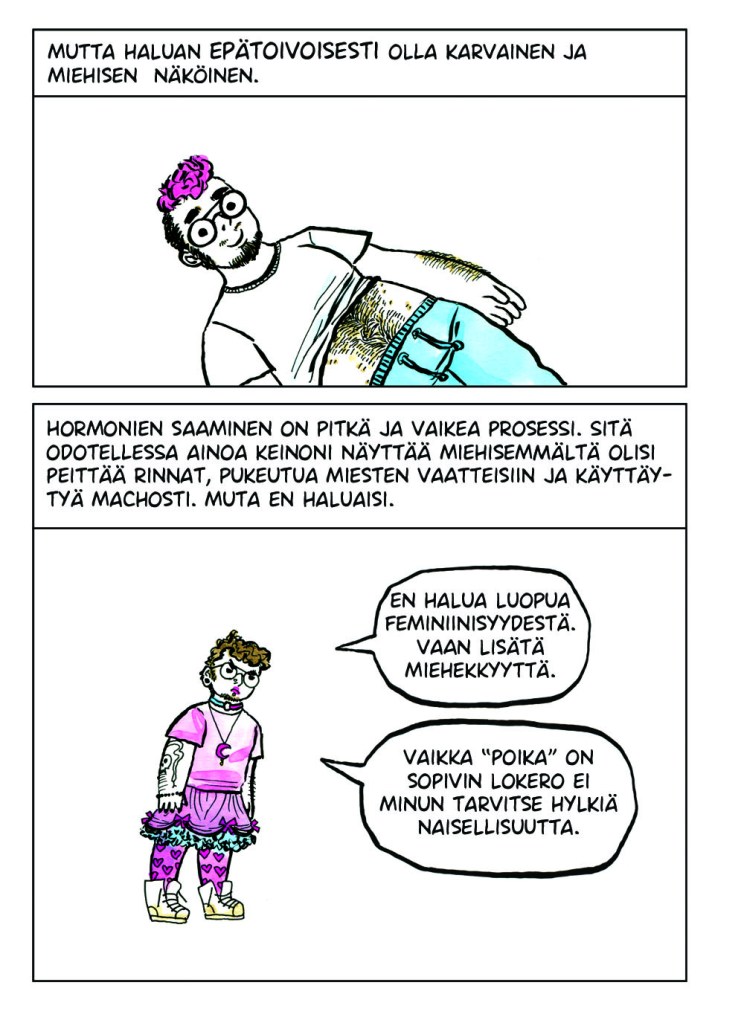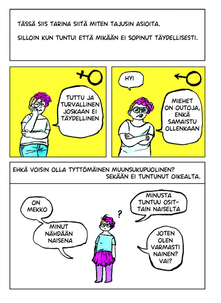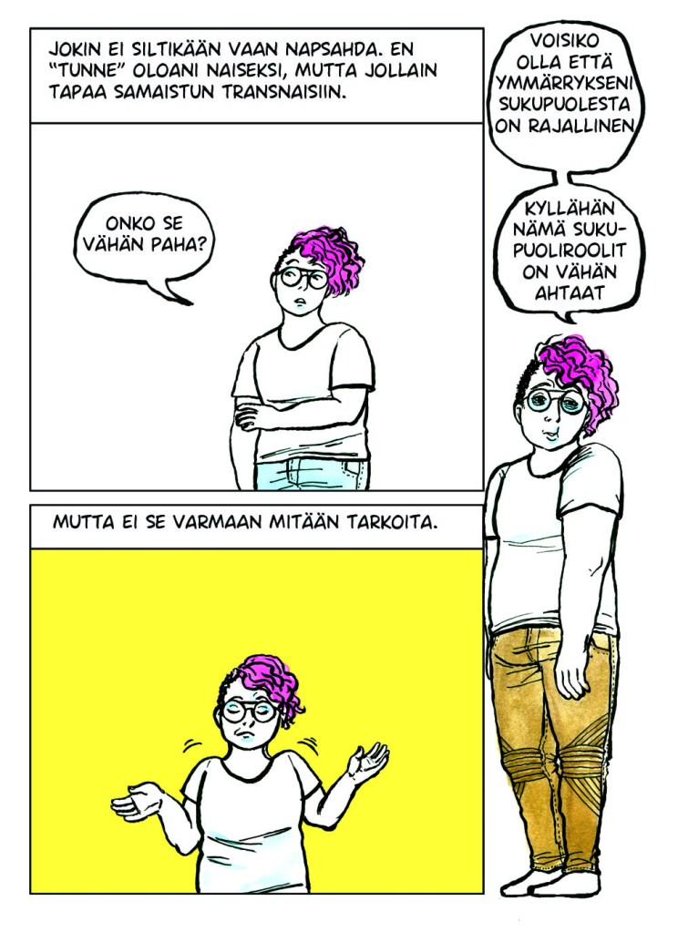 Itsensä jatkuva tarkkailu oli todella väsyttävää. Se tuntui typerältä koko sen ajan kun tein sitä, mutta en osannut lopettaa. Vaikka muutos olisi positiivinen, se voi viedä aikaa ja voimia. Kaikkeen kuitenkin sopeutuu lopulta. Noin vuoden päivät tarkkailin itseäni, kunnes eräänä päivänä huomasin lopettaneeni. Huoleni olemuksestani, huoleni ulkopuolisten tulkinnasta ja epämukavuus muutoksen keskellä olevasta minuudesta tasapainottuivat ja lakkasivat vaivaamasta päivittäisiä ajatuksiani. Tämän sarjakuvan tarina oli vasta alkua painiskelulleni sille kuka ja mikä minä olen.