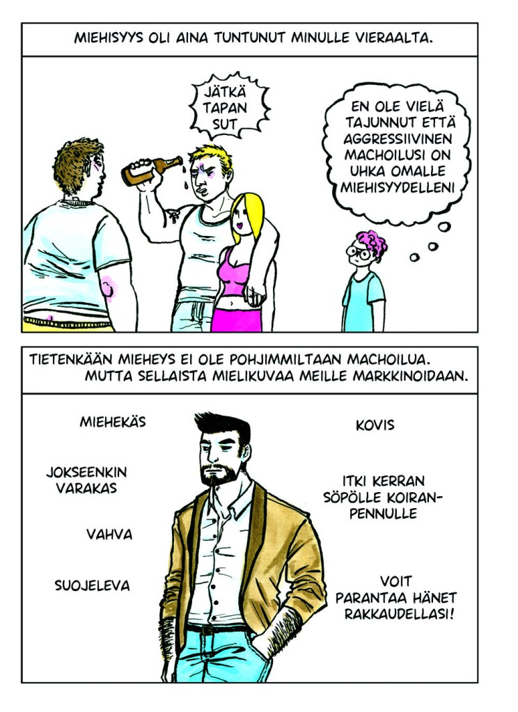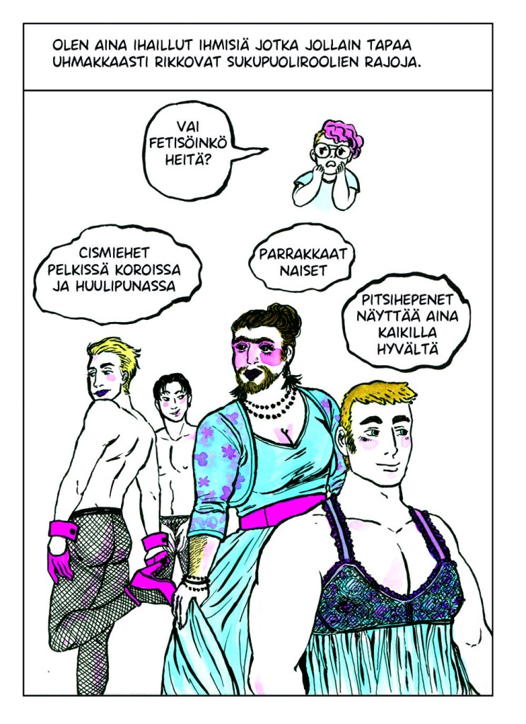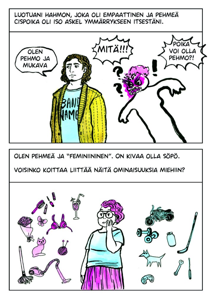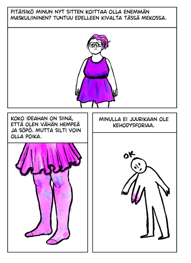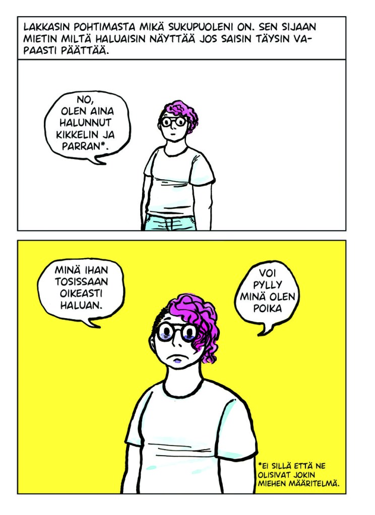 Itsensä jatkuva tarkkailu oli todella väsyttävää. Se tuntui typerältä koko sen ajan kun tein sitä, mutta en osannut lopettaa. Vaikka muutos olisi positiivinen, se voi viedä aikaa ja voimia. Kaikkeen kuitenkin sopeutuu lopulta. Noin vuoden päivät tarkkailin itseäni, kunnes eräänä päivänä huomasin lopettaneeni. Huoleni olemuksestani, huoleni ulkopuolisten tulkinnasta ja epämukavuus muutoksen keskellä olevasta minuudesta tasapainottuivat ja lakkasivat vaivaamasta päivittäisiä ajatuksiani. Tämän sarjakuvan tarina oli vasta alkua painiskelulleni sille kuka ja mikä minä olen.