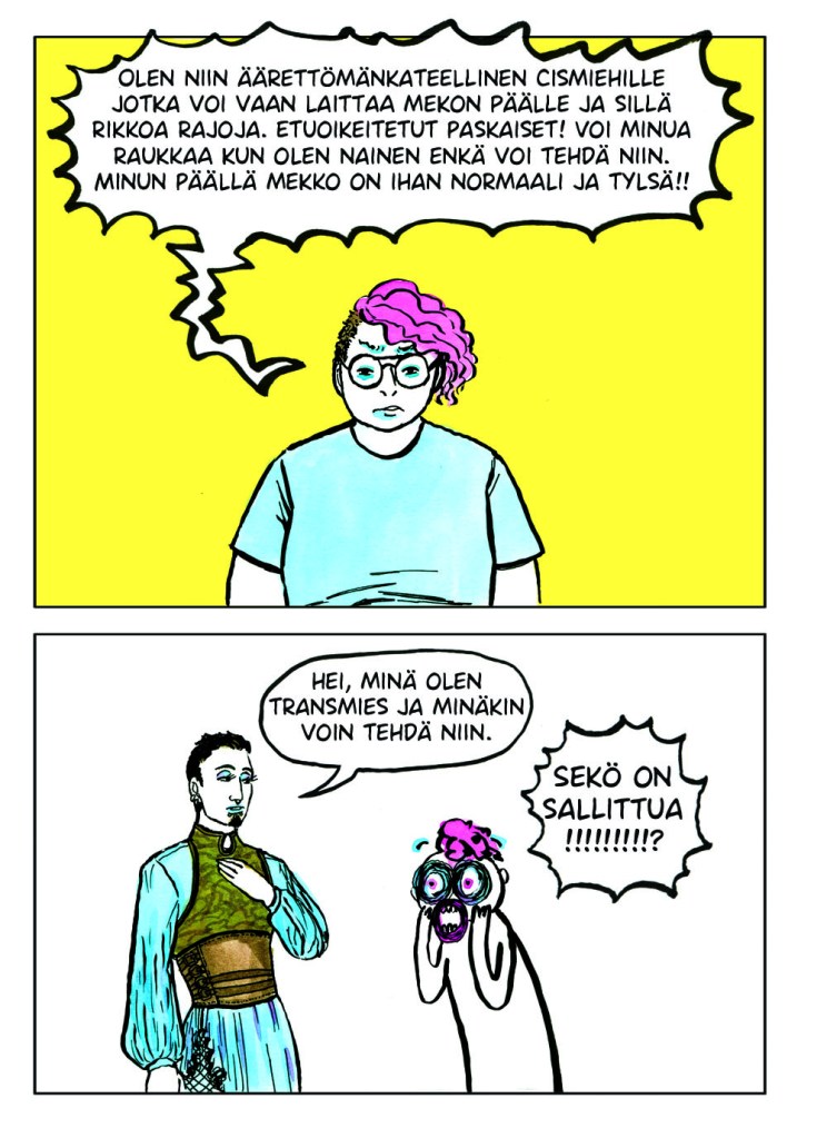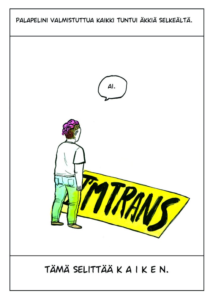 Piirsin tämän sarjakuvan 2018. Hyvin pian sen valmistumisen jälkeen sain tilaisuuden aloittaa hormonihoidot. En kuitenkaan virallista polkua pitkin, vaan täysin ilman lääkärin lupaa. Olen onnekas, sillä vasta nyt vuonna 2021 olen saanut ensimmäisen ajan transpolille.