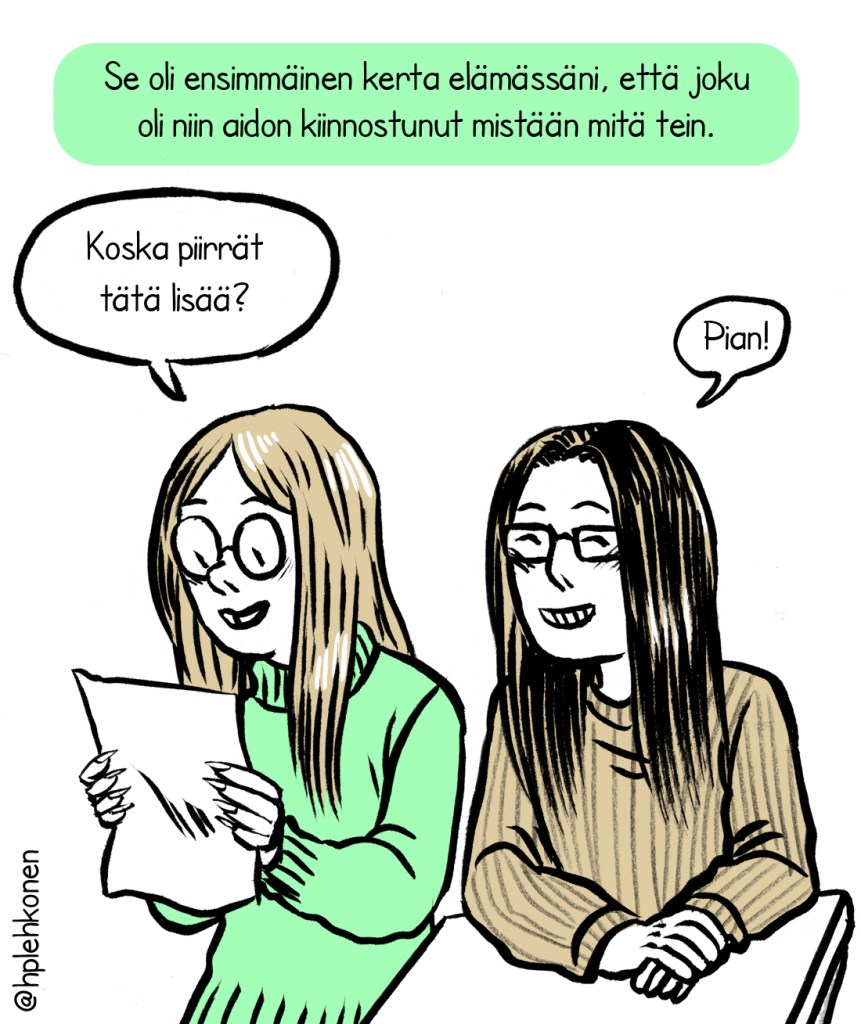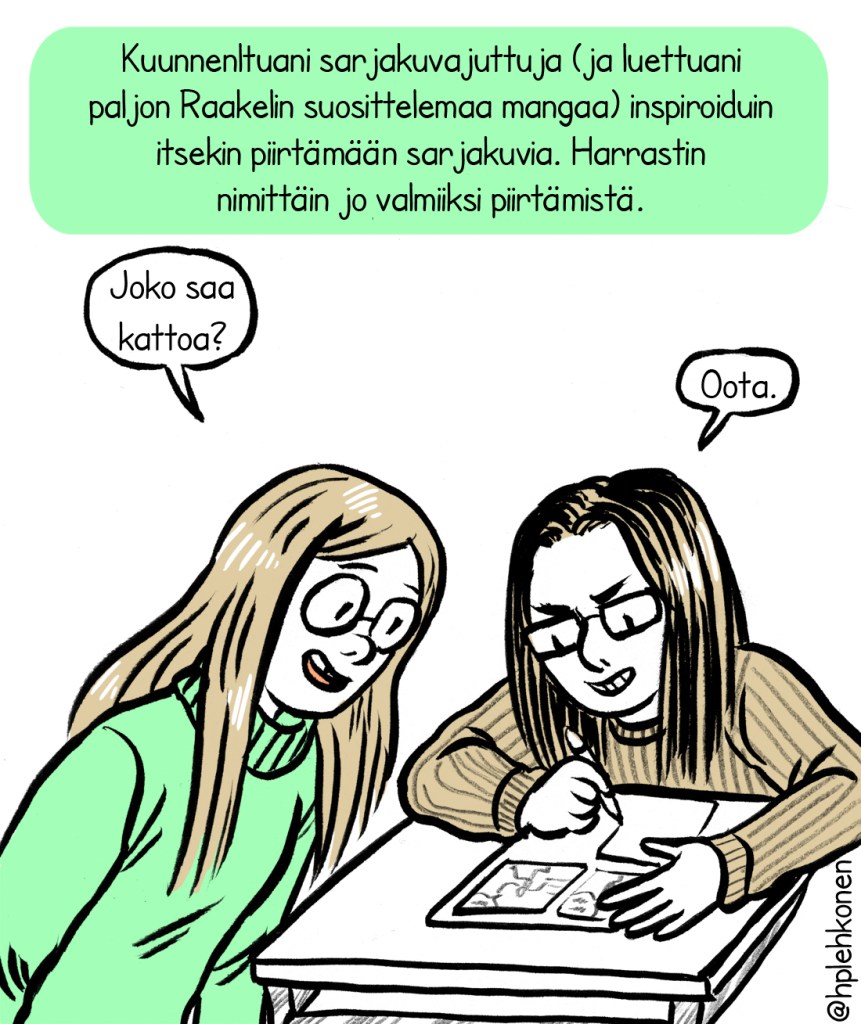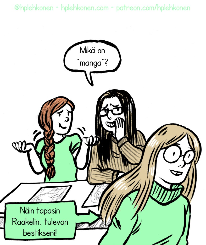 Yksi blogimme tärkeimpiä teemoja on yhteisöllisyys, ympärilläsi olevien ihmisten tuki ja toistensa auttaminen eteenpäin. Vaikka elämässäni on ollut paljon muitakin tukijoita, sarjakuvauraani on vaikuttanut eniten nuoruuden ystäväni Raakel. Miksi juuri hän? Annahan kun selitän.