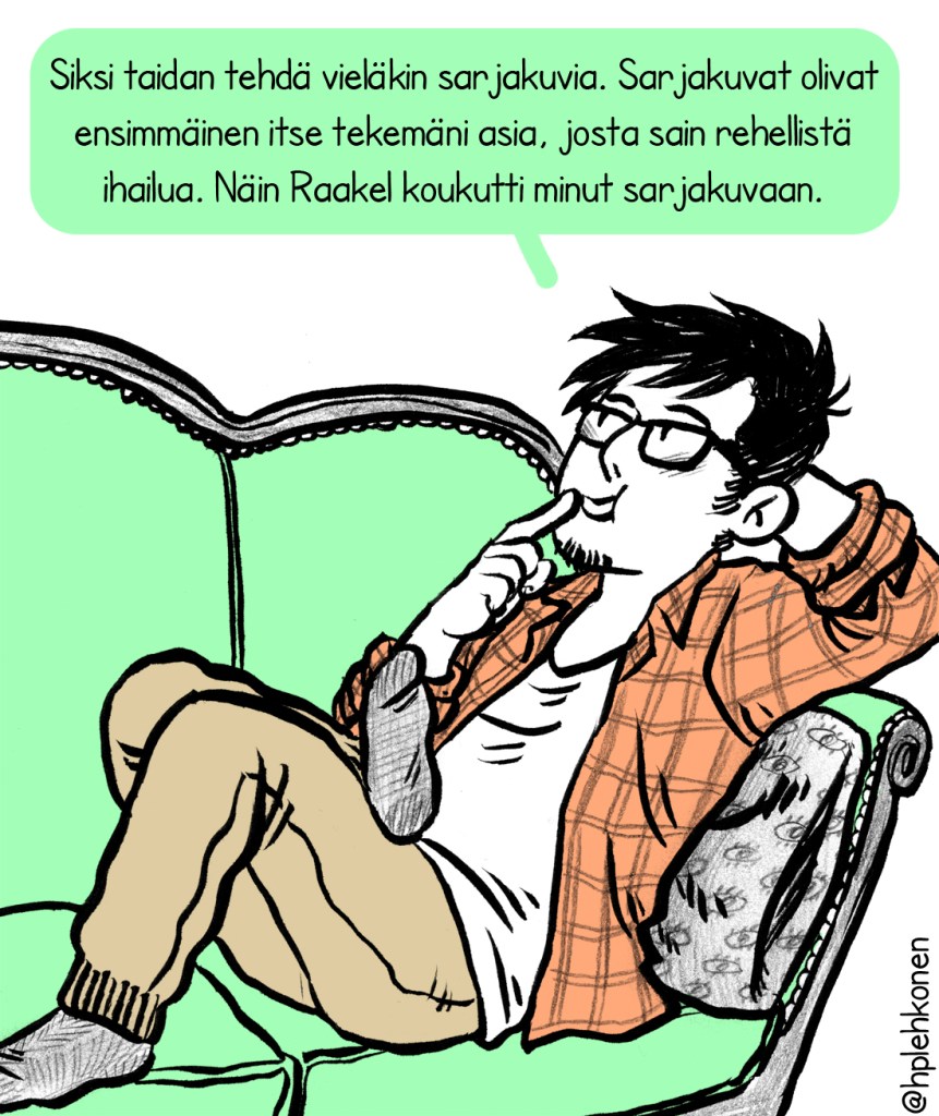 Vanhempani tukivat taidettani aina. Minua kuljetettiin joka viikko pikkukylästä keskustaan, iltaisin järjestettävään kuvataidekouluun. En tiedä mitä kyseinen harrastus maksoi, mutta tuskin se erityisen halpaa oli! Vanhempani myös yrittivät sanallisesti kehua piirtämistäni, mutta tässä kohtaa pääsemme itse aiheeseen. Vanhempieni kommentit taidettani kohtaan olivat usein sarjaa ”Vau, tosi hieno tuo, mikä se nyt ikinä onkaan? Ja lukeeko tuossa jotain? Tosi kiva!” Se oli palautetta, jota he osasivat antaa, sillä heillä ei ollut itsellään harrastuneisuutta sarjakuvan saralla. Palaute mitä sain Raakelilta oli täysin erilaista. Palautteeseen ei kuulunut vain ihailu siitä, että lapsi yritti ihan itse tehdä jotain, siihen kuului myös kritiikki.