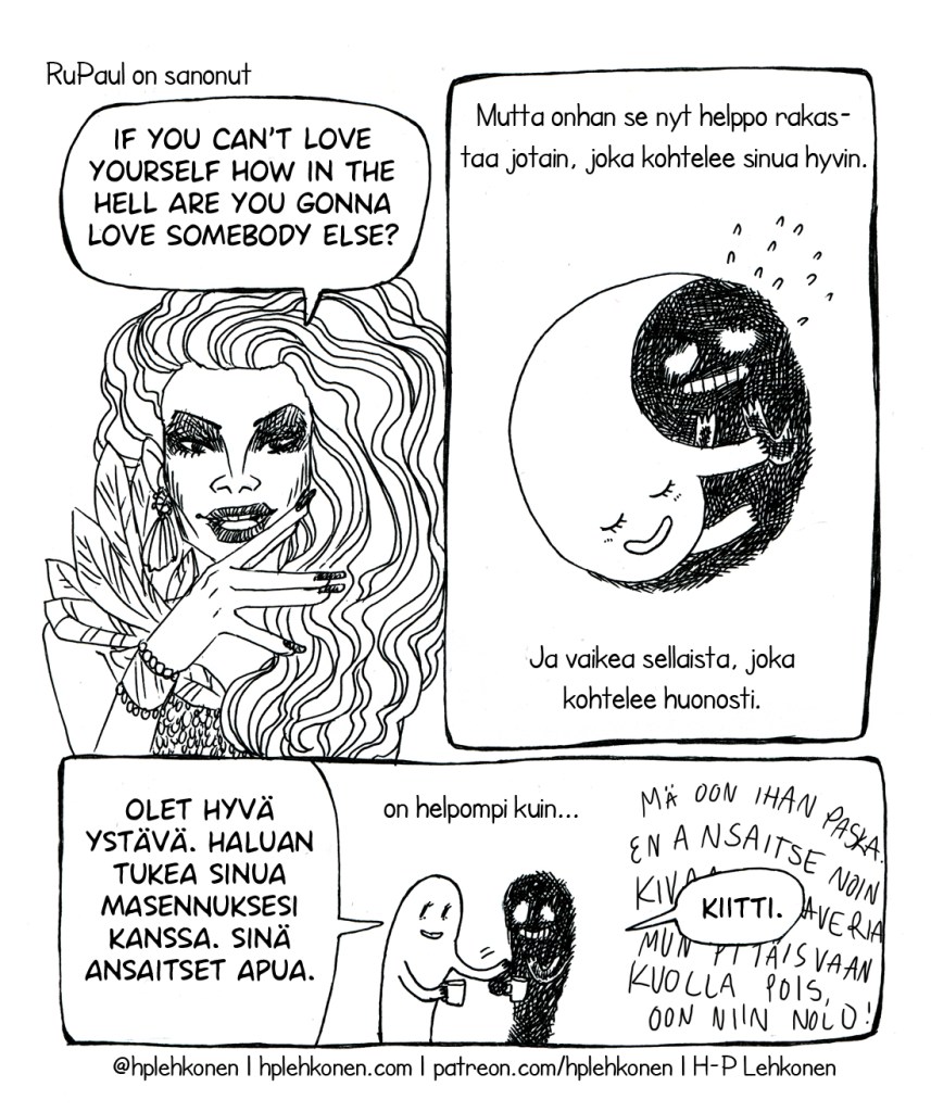 Olen itse kärsinyt menneisyydessäni masennuksesta, ja jännittävää kyllä, yksi suurimpia keinoja päästä masennuksesta yli oli puhua itselleen kauniisti. Sen sijaan, että olisin sanonut olevani laiska, sanoin olevani väsynyt. Sen sijaan että väitin olevani huono sarjakuvaharrastelija, aloin puhua itsestäni sarjakuvan ammattilaisena. Vähitellen oma ystävällinen kohteluni itseäni kohtaan muutti oman käsitykseni itsestäni. Kannattaa kokeilla, vaikka tämä keino saattaakin tuntua hieman yli-imelältä!
