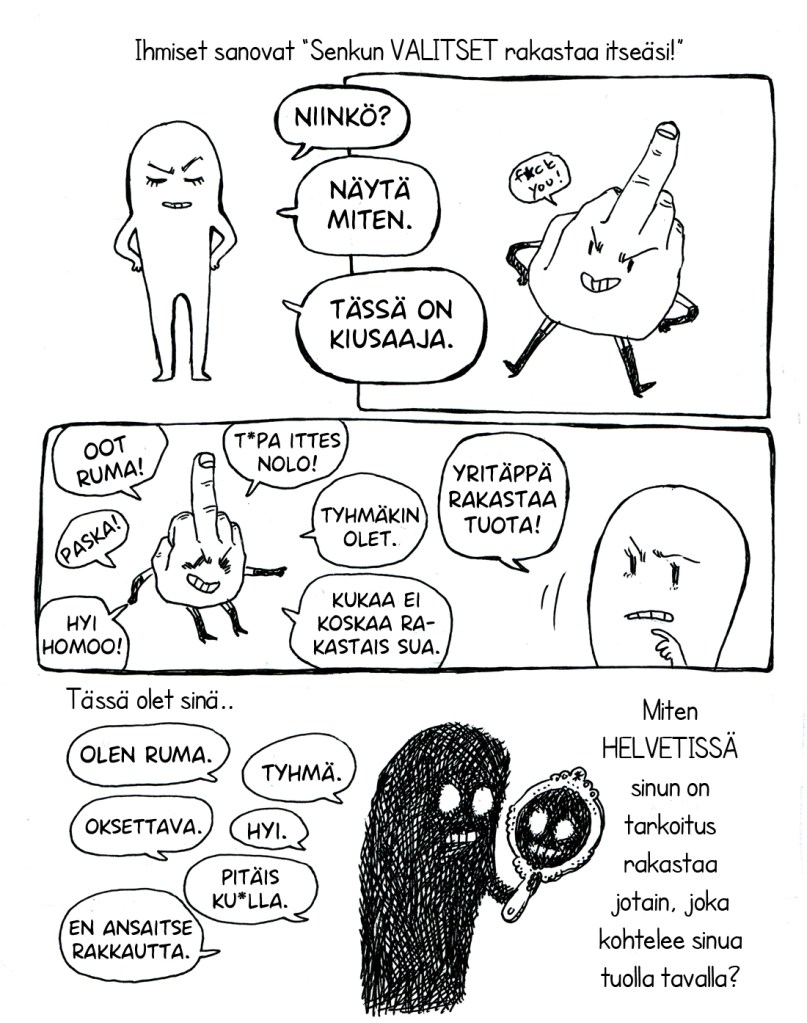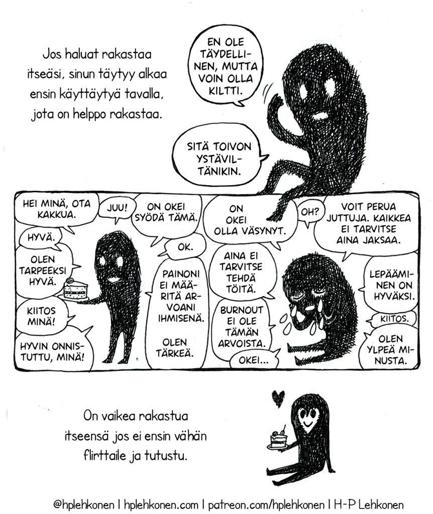 Itsensä rakastaminen ei aina ole helppoa, etenkään, jos kohtelee itseään huonosti. Sarjakuva kertoo tarkemmin, mitä itsensä kiltisti ja ystävällisesti kohteleminen tarkoittaa.