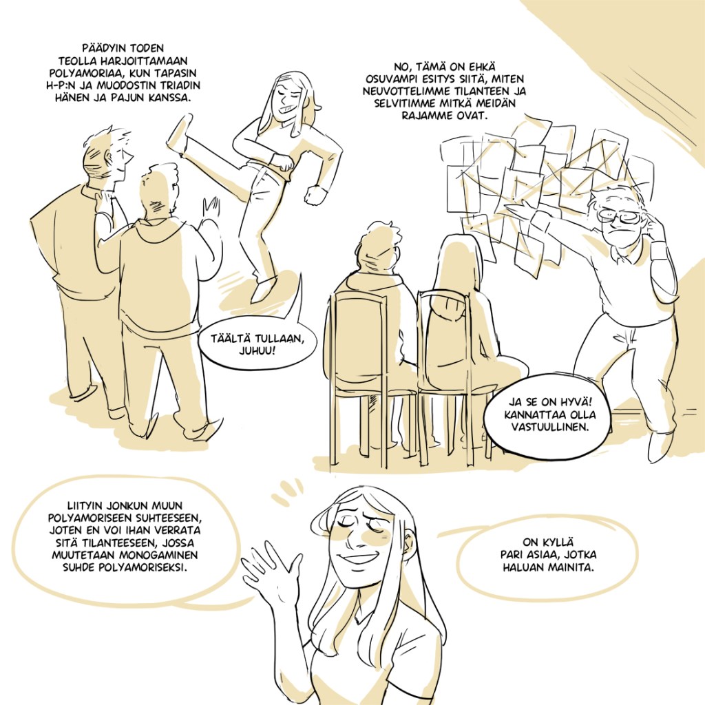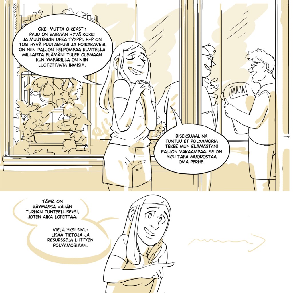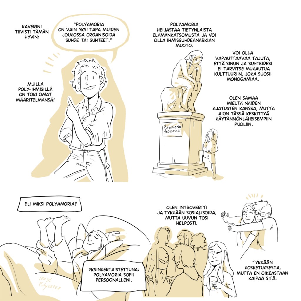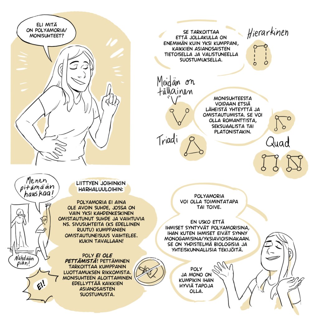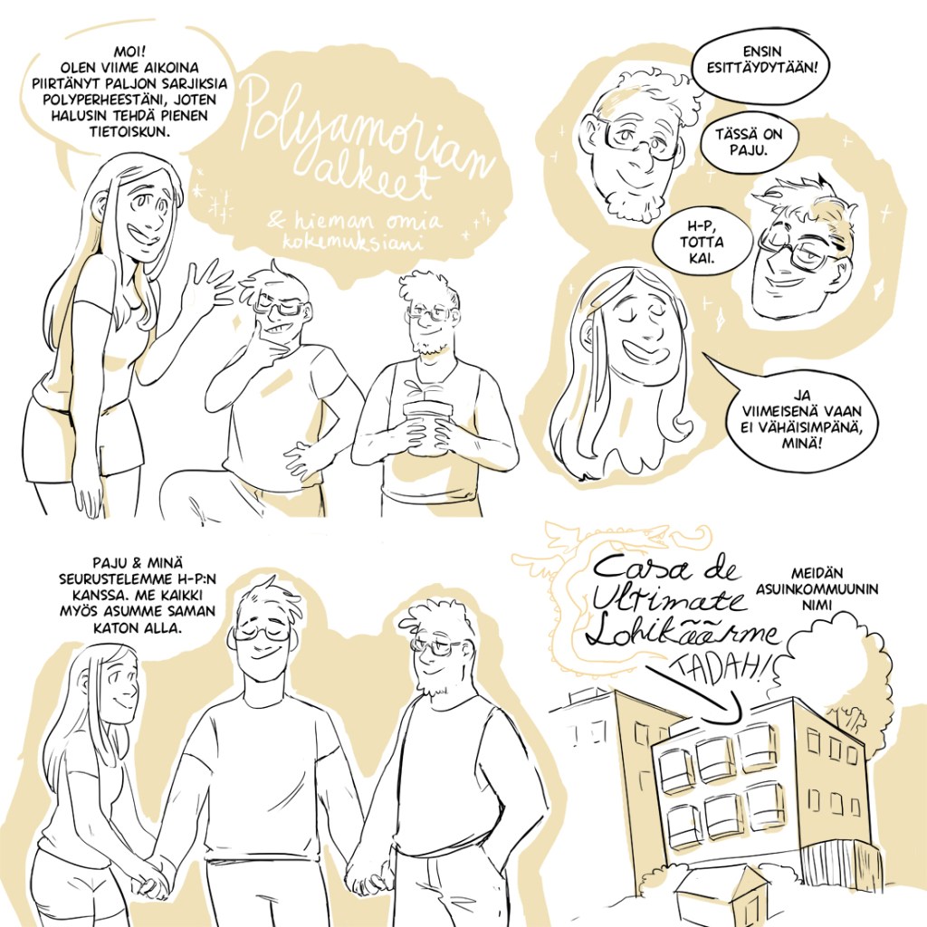 Polyamoria (tai monisuhteet), mitä se tarkoittaa? Yhdistyksemme jäsen Sara Valta, asuu monisuhteensa kolmen osapuolen kanssa kerrostaloneliössä ja kertoo nyt sarjakuvassaan kokemuksistaan. Jos et ole aiemmin kuullut polyamoriasta, on sarjakuvaan sisällytetty myös hieman määrittelyjä helpottamaan lukemista!
