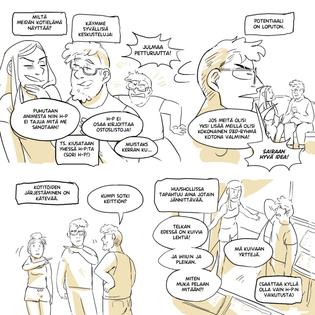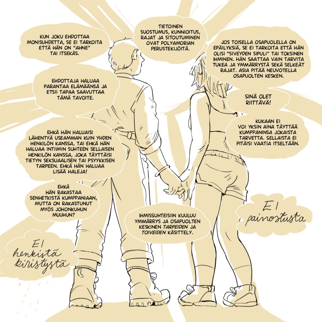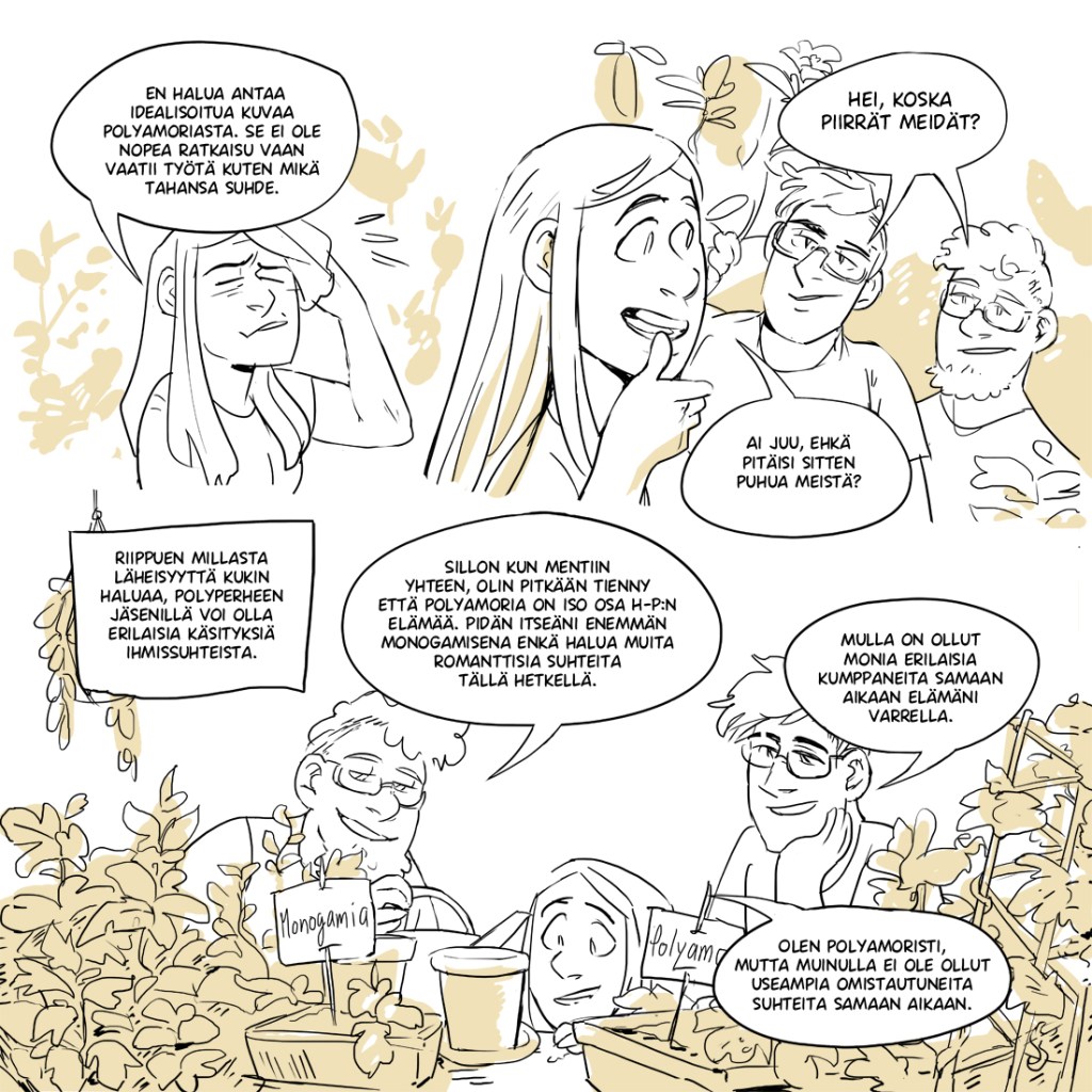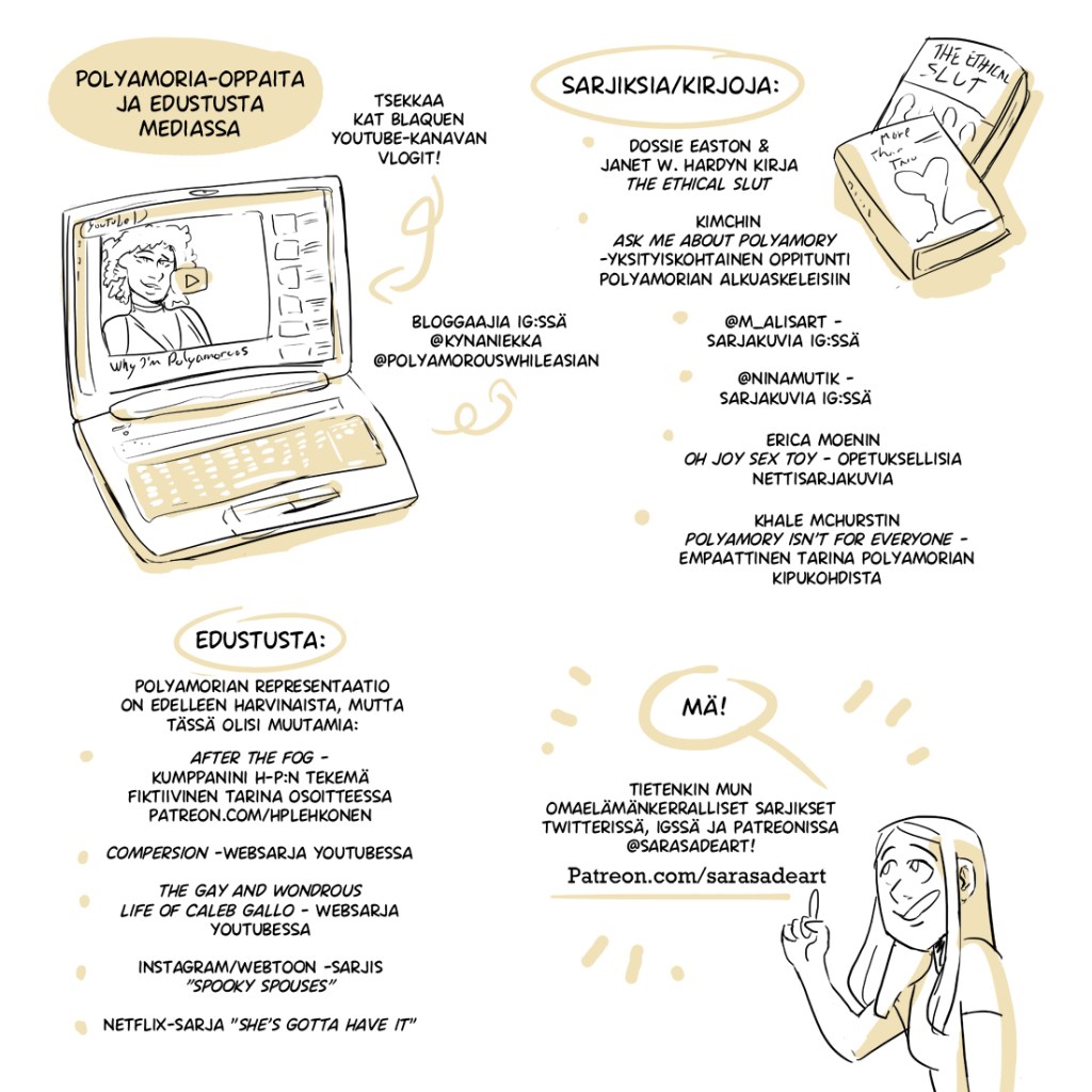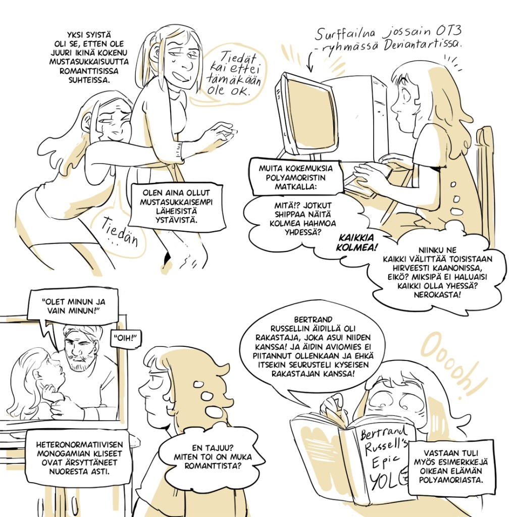 Polyamoria (tai monisuhteet), mitä se tarkoittaa? Yhdistyksemme jäsen Sara Valta, asuu monisuhteensa kolmen osapuolen kanssa kerrostaloneliössä ja kertoo nyt sarjakuvassaan kokemuksistaan. Jos et ole aiemmin kuullut polyamoriasta, on sarjakuvaan sisällytetty myös hieman määrittelyjä helpottamaan lukemista!