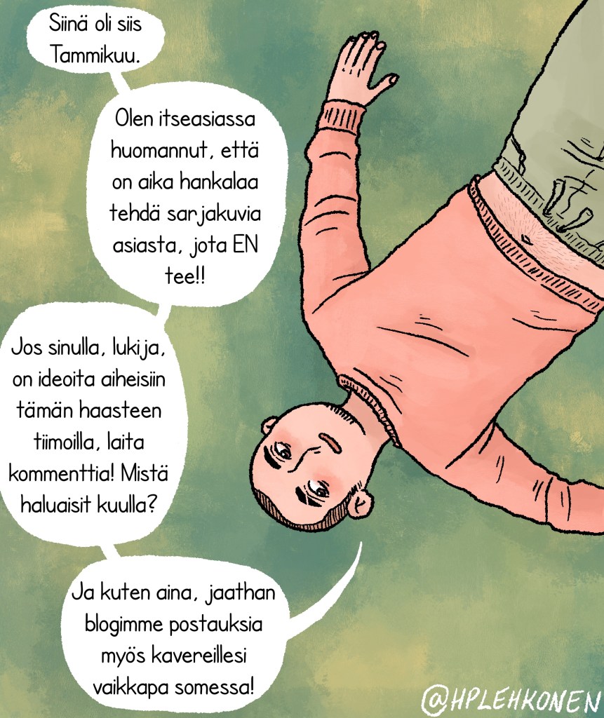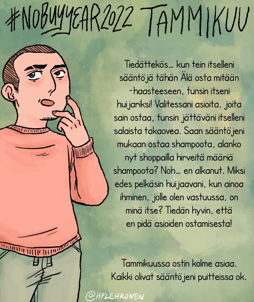 Onko sinulla, hyvä blogimme lukija, ajatuksia aiheisiin, joita H-P voisi käsitellä tämän vuoden aikana? Jätä kommenttia ja kerro millaisista teemoista haluaisit kuulla kokemuksia liittyen vuoden Älä osta mitään -haasteeseen!