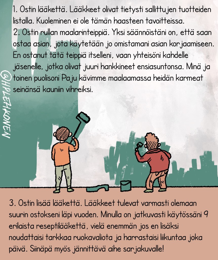 Ja sitten sitä sarjakuvaa! (Ruokaostoksia ei ole tähän sarjakuvaan listattu, sillä se olisi tylsää.)