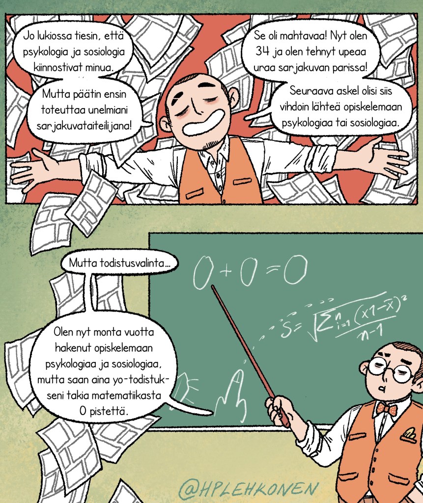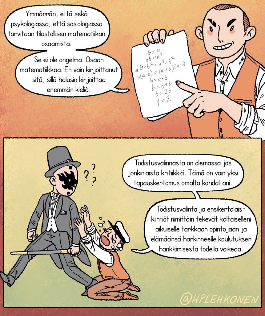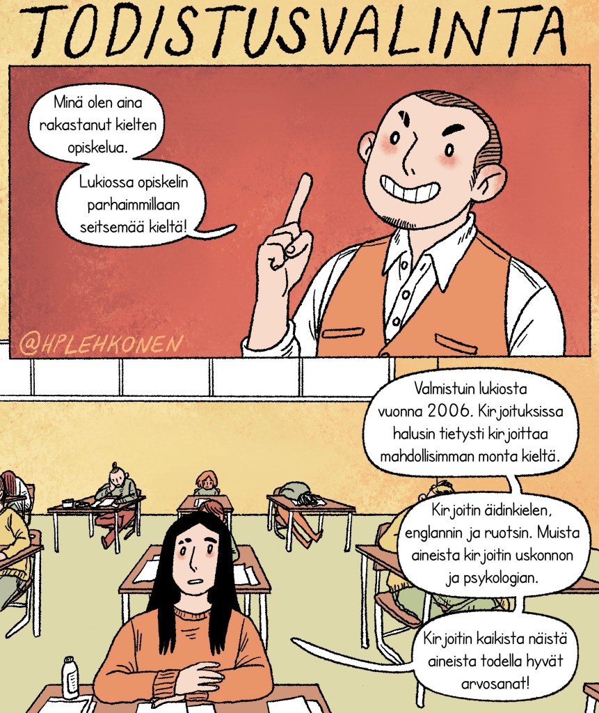 Yliopistojen todistusvalinta on koronan aikana laajentunut entisestään. Esimerkiksi aiemmin Psykologian opiskelijoista 60% valittiin todistusvalinnalla, nyt tuo määrä on 93%. Tämä syrjii niitä, jotka hakevat yliopistoon muulla pohjakoulutuksella, kuin lukiolla. Myös niillä, jotka ovat kirjoittaneet ennen todistusvalinnan käyttöä, on vaikeuksia, sillä he eivät ole optimoineet kirjoittamiaan aineita todistusvalintaan sopiviksi. Juuri tästä aiheesta kertoo H-P Lehkosen sarjakuva.
