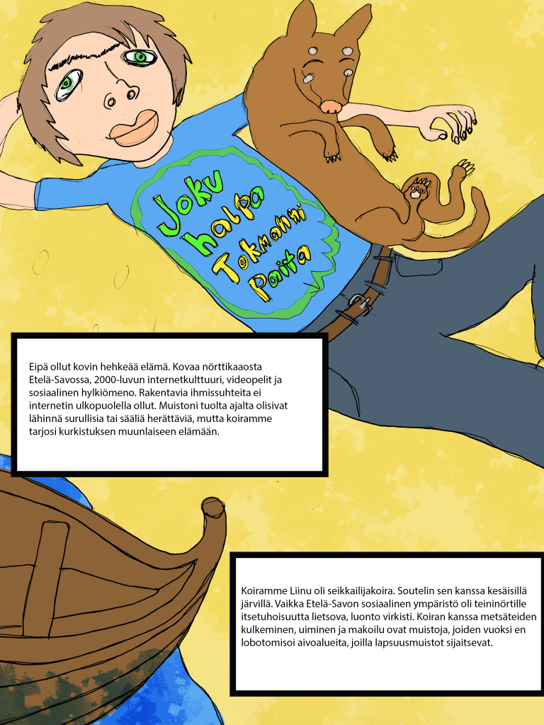 Ihmisen ja lemmikin ystävyys rikastaa elämää. Pohdimme ja muistelimme lajien välistä ystävyyttä tekstin ja sarjakuvan keinoin. Alkusanat kirjoitti Jami Pursiainen ja sarjakuvan teki Miika Auvinen ja väritti Paju Ruotsalainen.