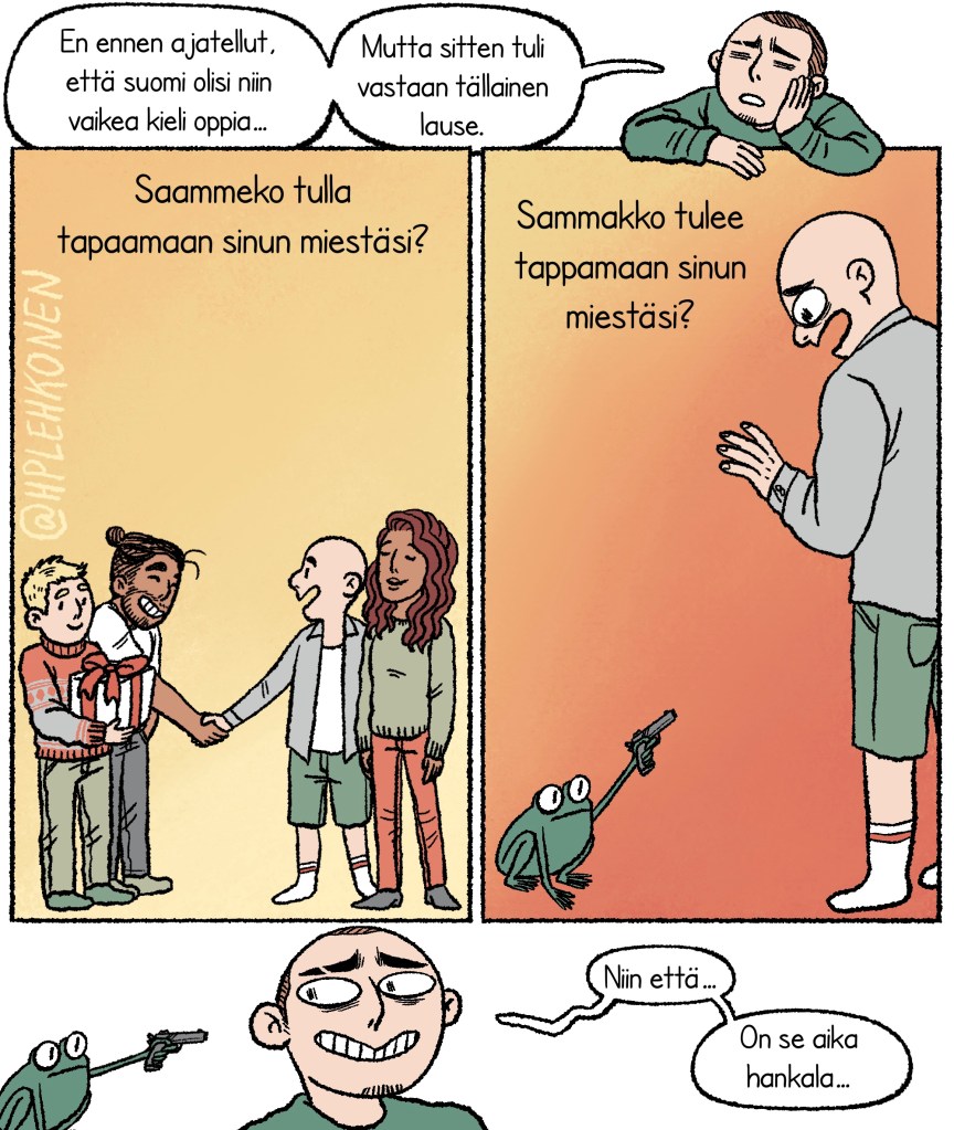 Suomea äidinkielenään puhuva ei aina huomaa oman kielensä kommervenkkejä, jotka tekevät sen vieraana kielenä oppimisesta hankalaa. Tämä sarjakuva kertoo hauskan esimerkin, jota pienestä asti suomea osannut ei tulisi ajatelleeksi.