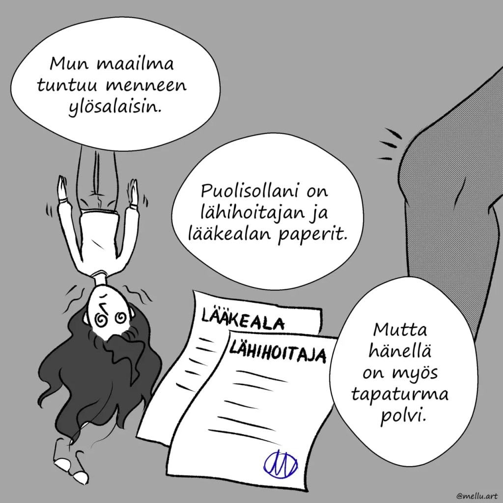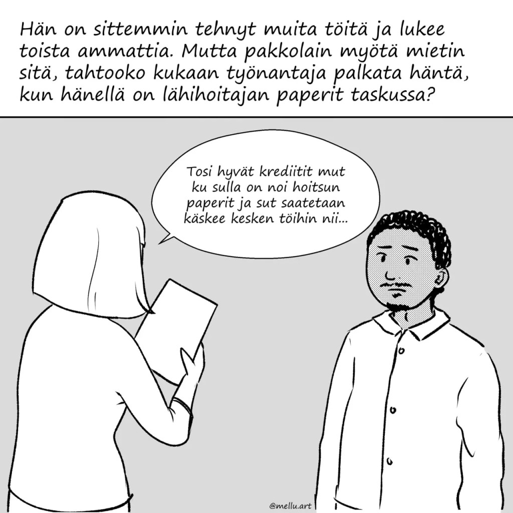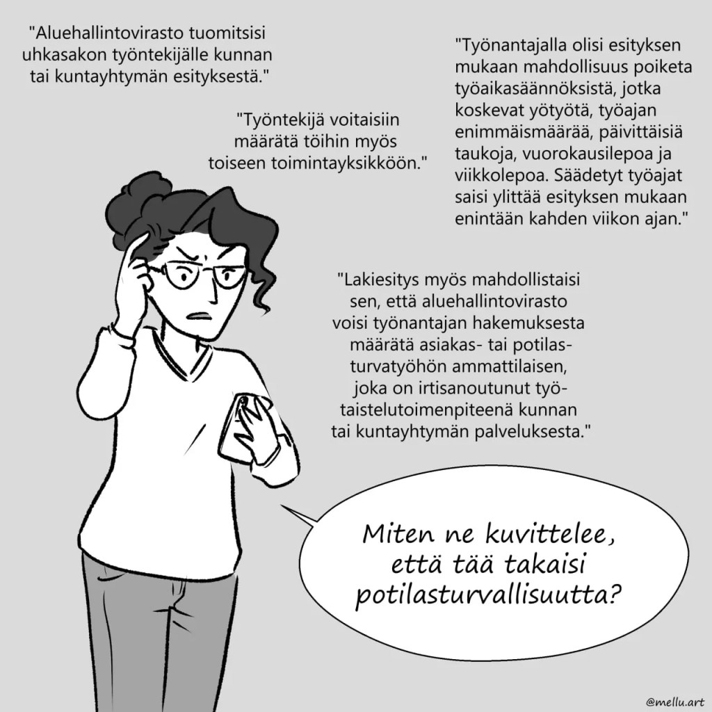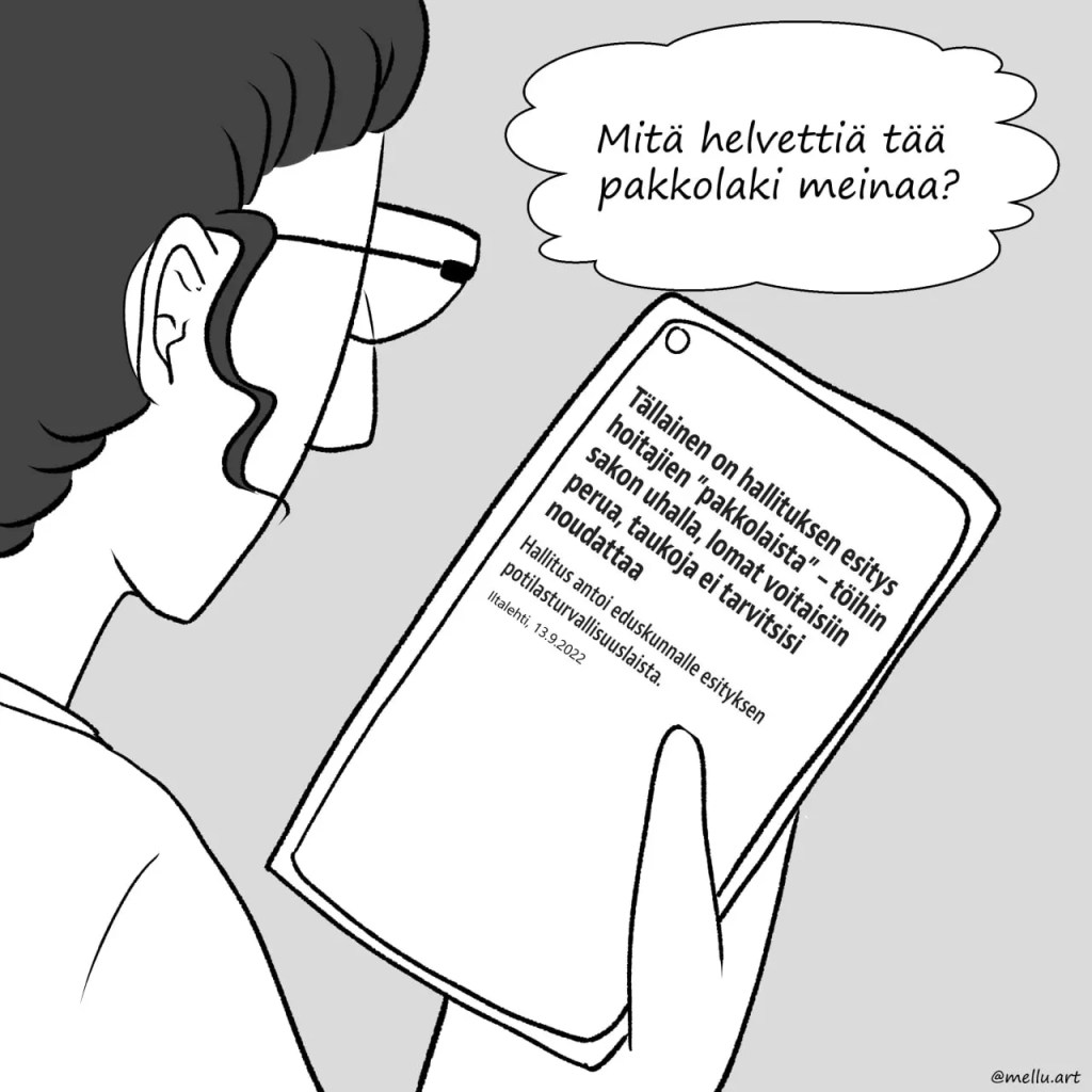 Hallituksen esitys hoitajien ”pakkolaista” sai sarjakuvataiteilija Maryam ”Mellu” Abuzaid-Ryun tarttumaan kynään. Teos kertoo miltä tuntuu pelätä omaa terveyttään ”potilasturvallisuuden” vuoksi.