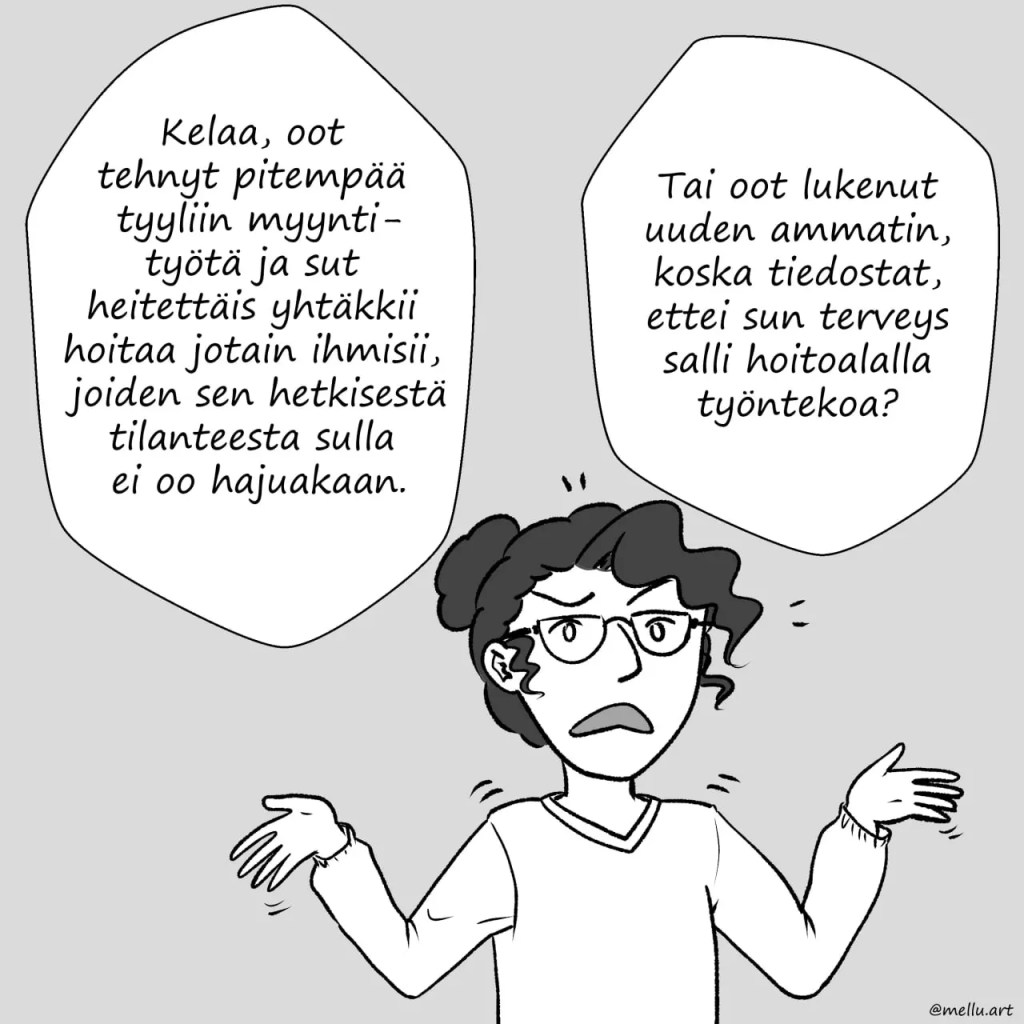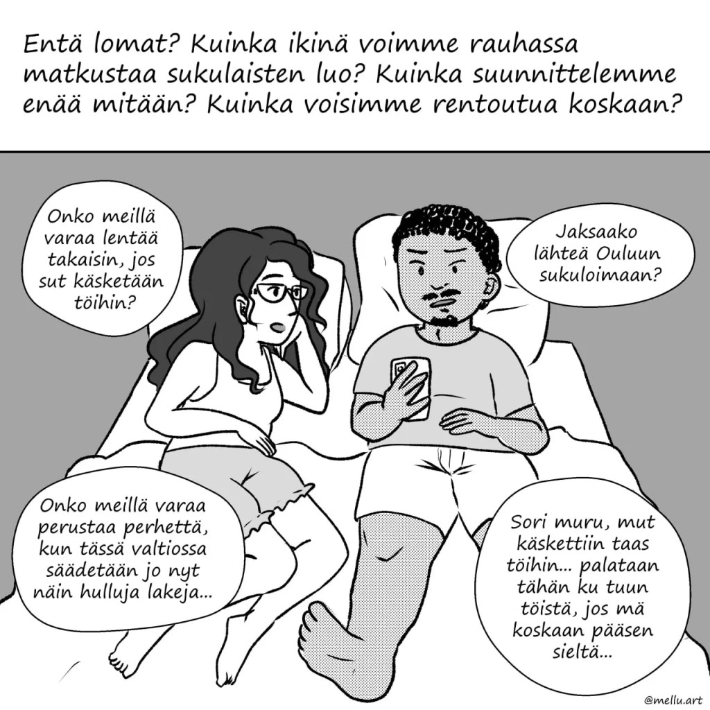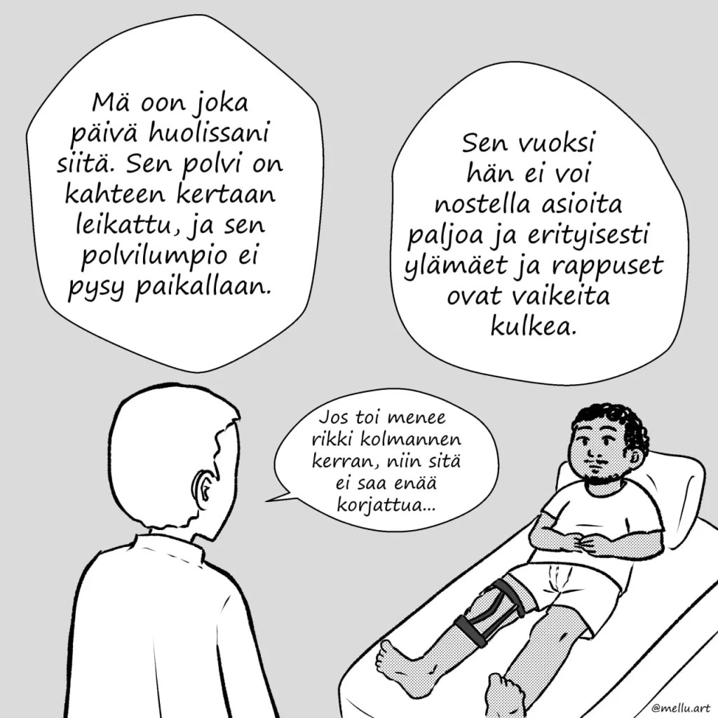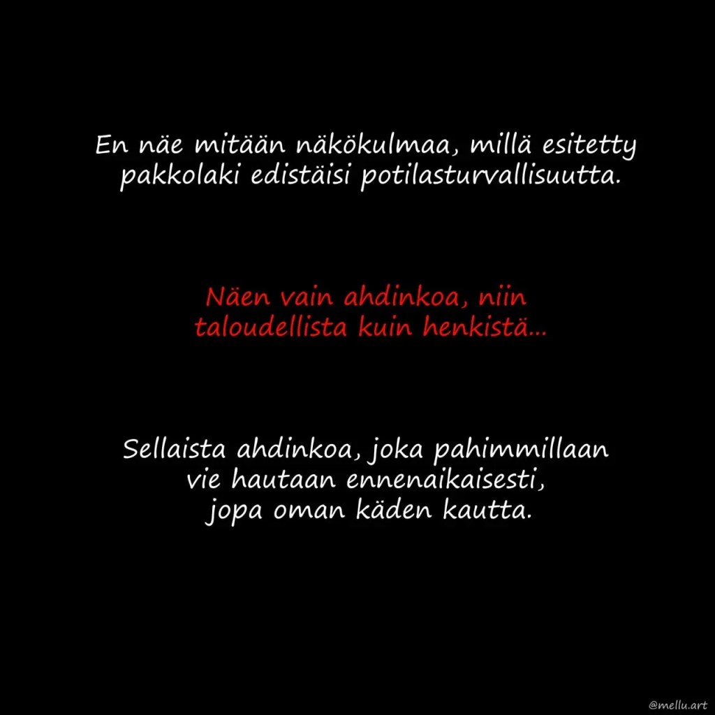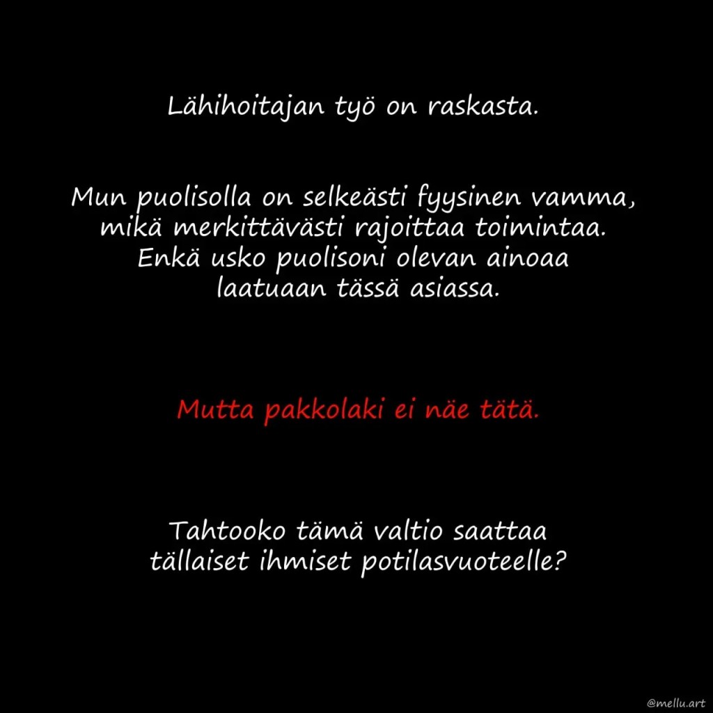 Hallituksen esitys hoitajien ”pakkolaista” sai sarjakuvataiteilija Maryam ”Mellu” Abuzaid-Ryun tarttumaan kynään. Teos kertoo miltä tuntuu pelätä omaa terveyttään ”potilasturvallisuuden” vuoksi.