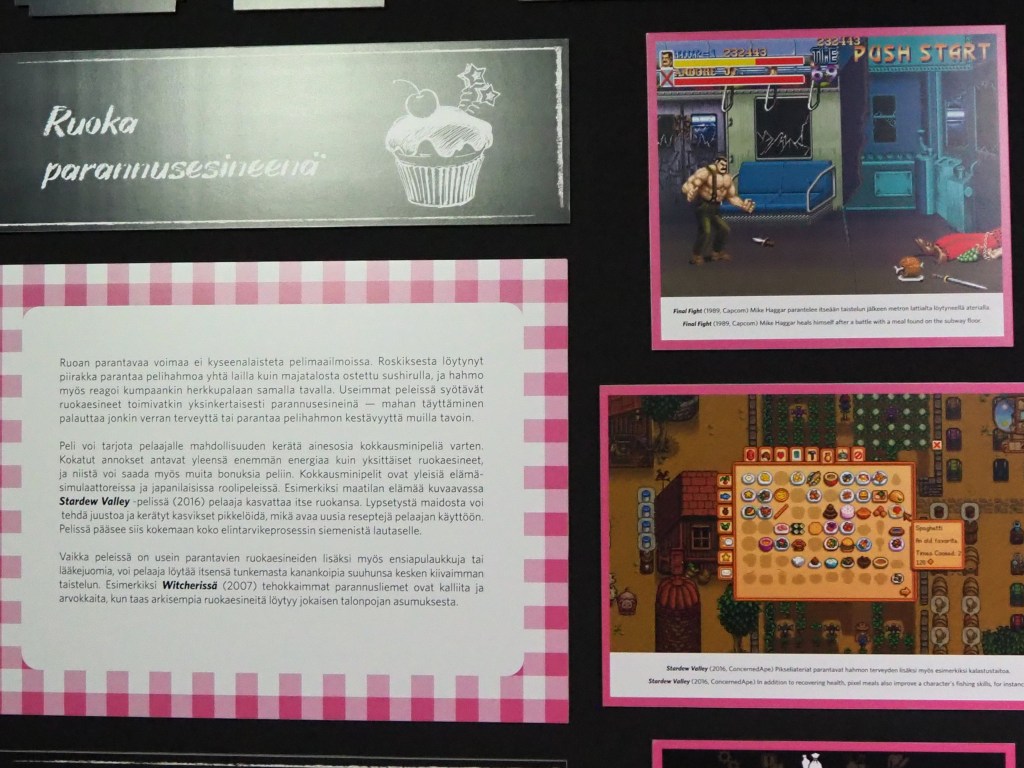 Peliruokailua olemme käsitelleetkin blogissamme illallisreportaasin puitteissa. Näyttely esitteli, millaisia funktioita ruualla on peleissä, ja kuinka ruokakuvaukset ovat kehittyneet parannusesineistä osaksi pelimekaniikkaa ja tunnelmanluontia.