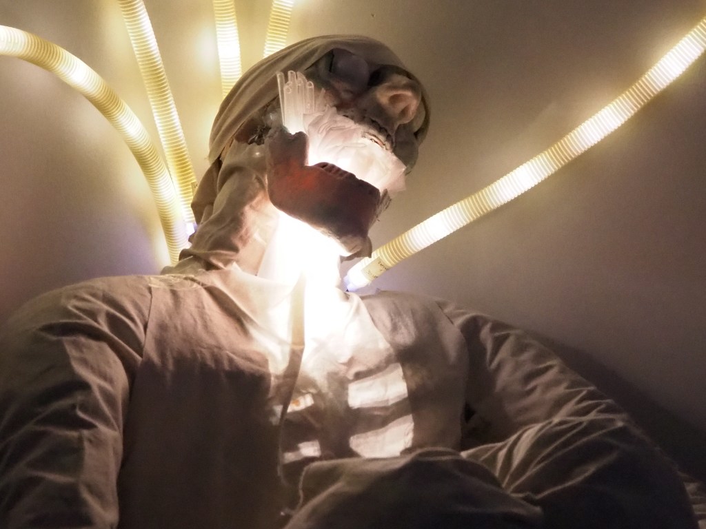 Yksi osa näyttelyjä olivat erilaiset valoteokset. Yksi niistä oli kävijän liikkeisiin reagoiva kärsivä herrasmies eräässä tilan nurkassa.